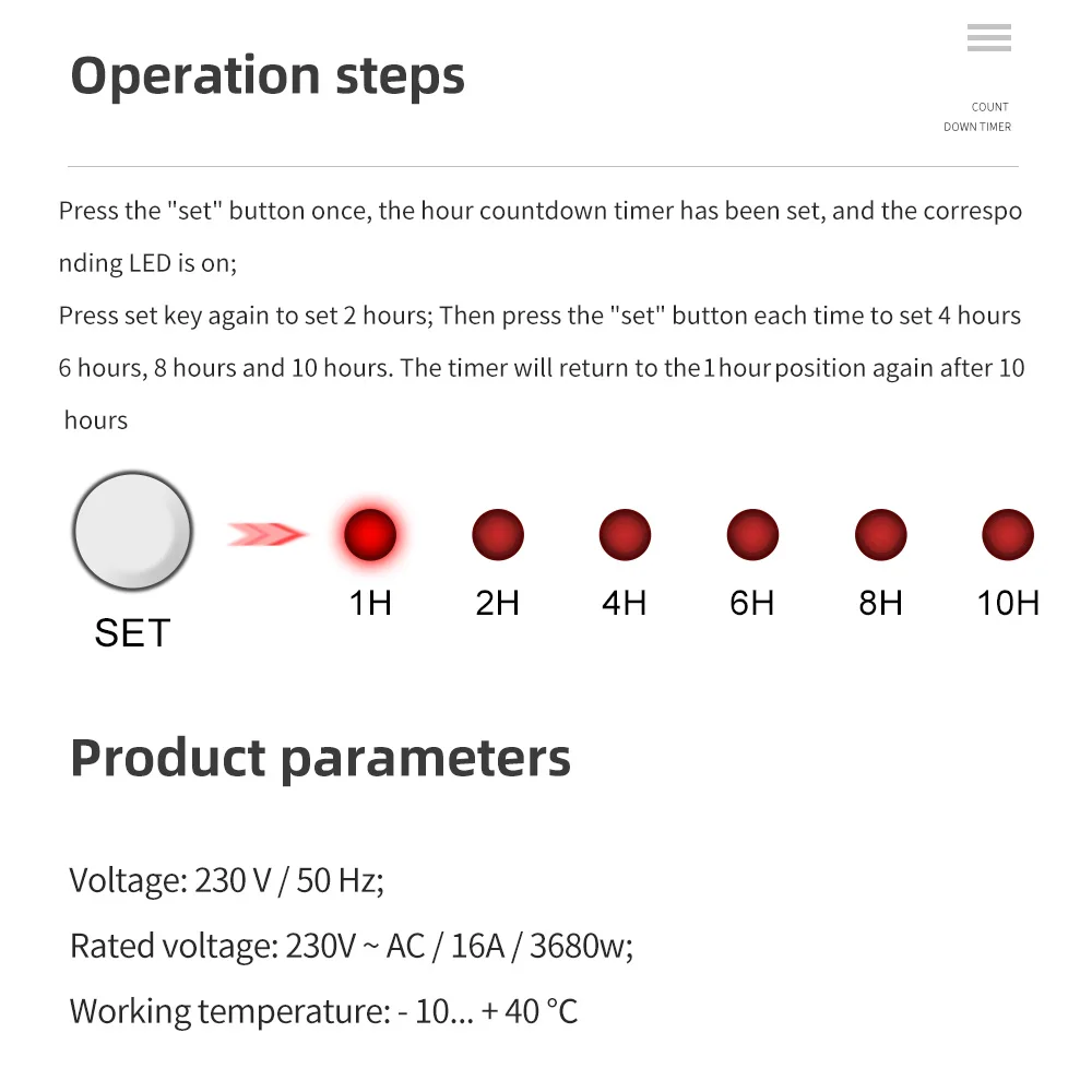press"set"button once time ,1 hour countdown timer already set up and the 1 hour led light on .