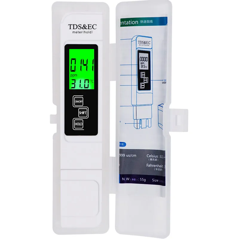 3-In-1 Digital TDS meter provides accurate readings for TDS (Total Dissolved Solids) EC (Electrical Conductivity) and temperature. Professional, Accurate, and Precise 3-in-1 TDS, EC, and Water Temperature Meter. The TDS meter has automatic temperature compensation in measurement mode. 5 minutes no operation, the meter will automatically shut down. Save power, extend battery life
