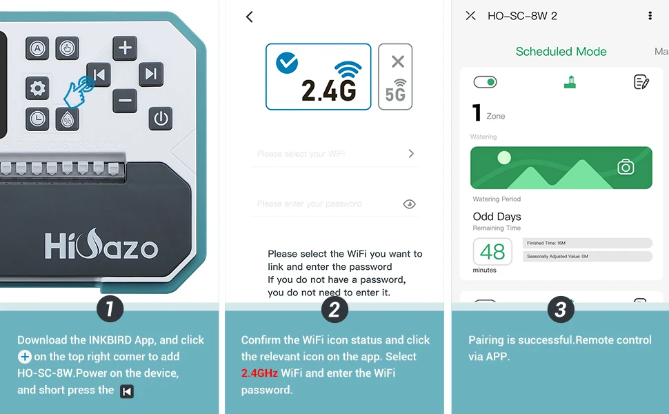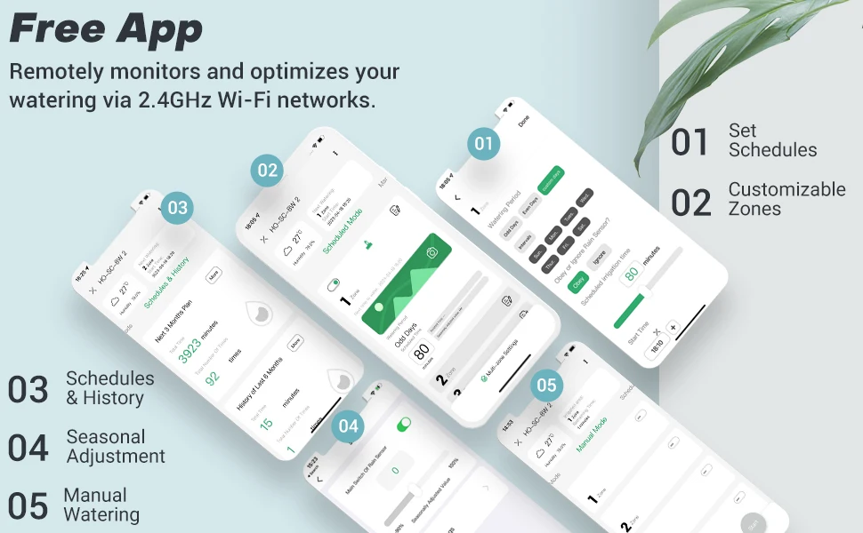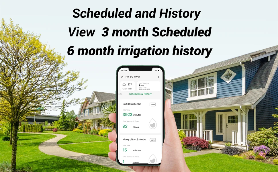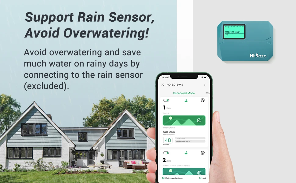 WiFi remote control and non-volatile memory: This irrigation control has a built-in 2.4G WiFi module. You can set the watering plan and monitor the watering process in the app. A non-volatile memory is integrated into the sprinkler control, which can store all settings indefinitely even after prolonged shutdown.