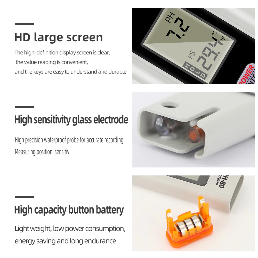 The PH-80 is an economically priced, reliable pH meter (aka pH pen or pH tester) that is ideal for testing applications such as hydroponics & gardening, pools & spas, aquariums & reef tanks, water ionizers, drinking water, boilers and cooling towers, wastewater and more. The PH-80 measures pH and Temperature. Features include one-touch automatic digital calibration,water resistant body, simultaneous temperature display, sleek, lightweight design, a large LCD display, Automatic Temperature Compensation (ATC), Auto-off function, data-hold function and low-battery indicator. Each meter includes storage solution and a single use pH 7.0 buffer pack. The PH-80 is factory calibrated for your convenience and can easily and quickly be recalibrated with digital calibration to pH 4.0, 7.0 or 10.0 using the meter's simple one-touch process.
