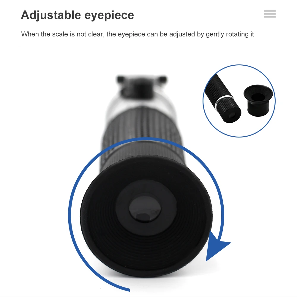 This optical refractometer (honey meter) has 3 scales: 10 - 33 % for measurement of honey moisture, 58-90% for brix, 38 - 43 Be for Glucose Baume. It is suitable not only for beekeepers but also for all who needs check bee honey quality (e.g. in food industry).