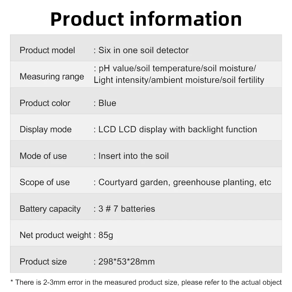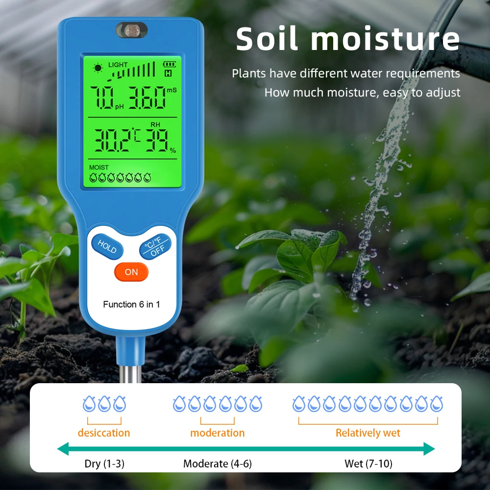 Integrates 6 testing functions of soil fertility, pH, temperature, humidity, light, and air humidity in one, guarding the growing environment of plants in all aspects and providing scientific growing conditions for your plants. With this product, regardless of changes in light intensity or fluctuations in environmental humidity, you can quickly and reliably understand the soil condition and adjust it as needed to make the most suitable soil environment for plant growth and improve crop yield and quality. Perfect for pot planting, greenhouse planting, scientific research planting, flower planting, vegetable planting, fruit planting, etc.