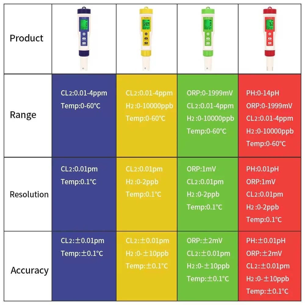 4-in-1 water quality testing pen backlight (ORP/CL2/H2/Temperature)