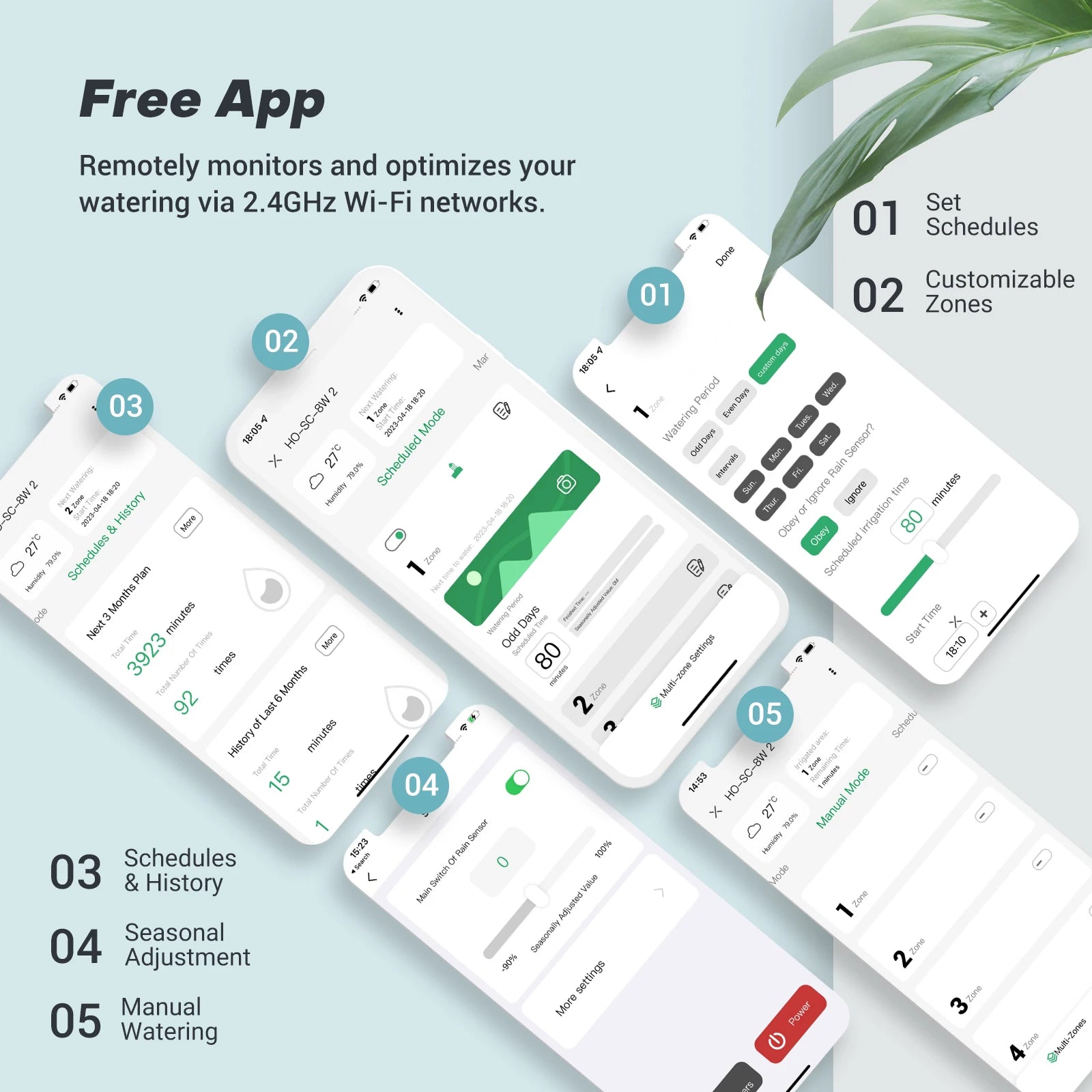 WiFi remote control and non-volatile memory: This irrigation control has a built-in 2.4G WiFi module. You can set the watering plan and monitor the watering process in the app. A non-volatile memory is integrated into the sprinkler control, which can store all settings indefinitely even after prolonged shutdown.